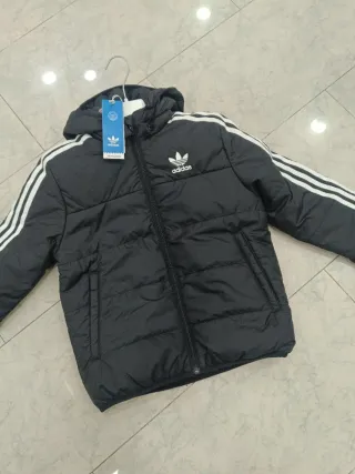 Giubbotto imbottito Adidas per bambino, taglia 9/10 anni. Colore nero con le iconiche tre strisce bianche sulle maniche. - Cappuccio integrato. - Chiusura frontale con zip. - Logo Adidas sul petto.