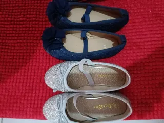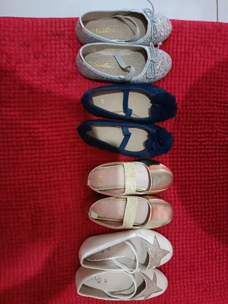 Lotto di ballerine per bambina in diverse fantasie e colori. Taglie 26 e 27. - Ballerine glitter argento con cinturino. - Ballerine blu con fiore decorativo. - Ballerine rosa/oro con cinturino. - Ballerine bianche con stella glitter.