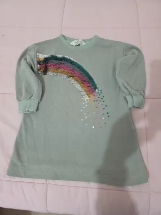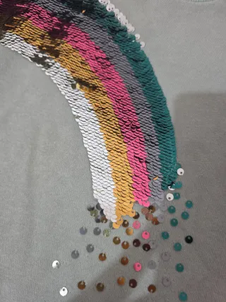 Maglietta a maniche lunghe per bambina, taglia 110 cm. - Fantasia arcobaleno con paillettes reversibili. - Colore base verde acqua. - Polsini e colletto a costine.