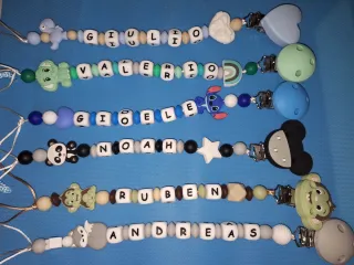 Set di catenelle porta ciuccio personalizzate con lettere e simpatici personaggi. Il prezzo indicato è per singolo pezzo cambio solo il nome Scrivimi quale modello vuoi creato e farò una vendita a parte