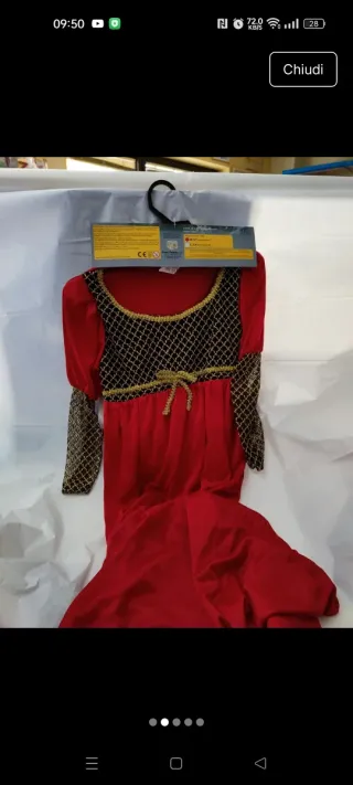 Costume da bambina ispirato a Giulietta, perfetto per feste in maschera. - Abito lungo rosso con dettagli dorati. - Maniche a sbuffo e corpetto decorato. - Include copricapo abbinato.