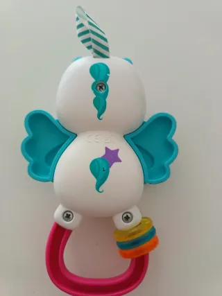 Sonaglio colorato a forma di unicorno con ali e arcobaleno. - Design a forma di unicorno con ali azzurre. - Dettagli arcobaleno e stelle sul corpo. - Anelli colorati per stimolare la presa.