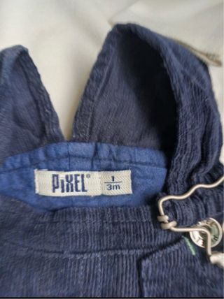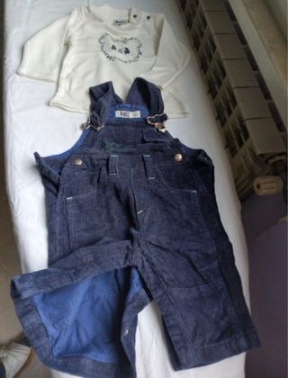 Completo per neonato composto da maglietta a maniche lunghe e salopette. - Maglietta bianca con stampa sul davanti. - Salopette blu in velluto a coste. - Taglia 6 mesi.