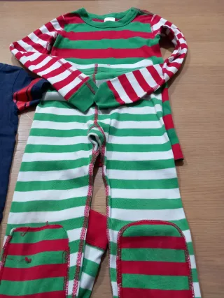 Pigiamino per bambini con fantasia a righe. - Maniche lunghe. - Fantasia a righe rosse, verdi e bianche.piuun body blu notte con scritta rossa.