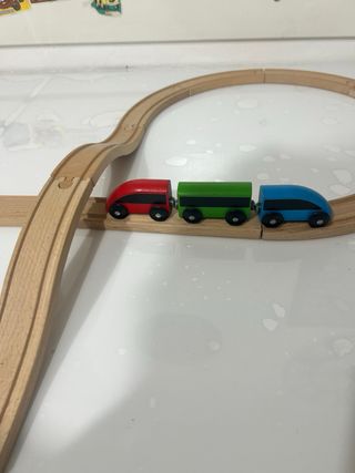 Set di binari per trenino in legno Ikea, con tre vagoni colorati. - Binari in legno naturale. - Tre vagoni inclusi: rosso, verde e blu.