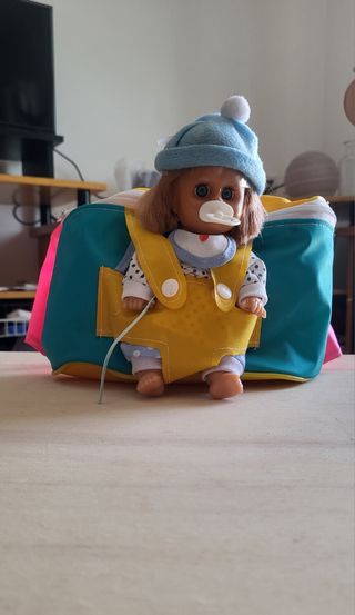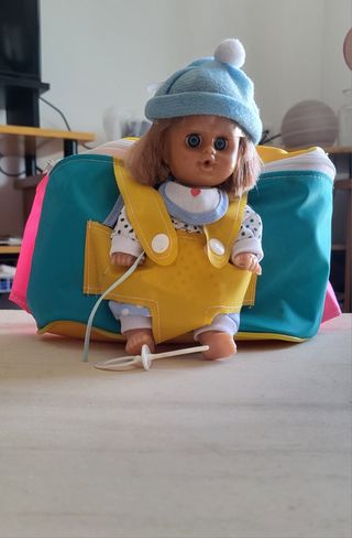 Cicciobello sonoro (H 16cm) con marsupio (18×11×8cm ca). Riproduce il suono del ciucciotto. Condizioni più che ottime, presenta qualche macchia gialla sui vestiti causata dal tempo, va via immediatamente dopo un lavaggio. Mai usato/giocato, tolto dalla confezione per pessime condizioni della stessa.