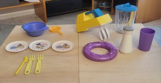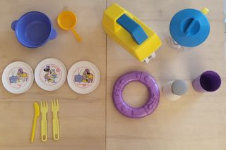 Posate, piatti e padella €1 Pentola, saliera e bicchiere €1 Frullatore €1 Sbattitore €1 Salvagente per bambola €1