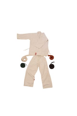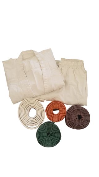 Abbigliamento per Karate e 4 cinture #Giacca: #spalle 53cm, #petto 54cm, #vita regolabile 52cm, #manica 37cm, #lunghezza totale 71cm; #difettiinfoto #Pantaloni: #vita 28cm, #Fianchi 50cm, #cavallo 29cm, coscia 31cm, #Caviglia 24cm, #lunghezza totale 87cm #Cintura: #bianca, #marrone, #arancione, #verde 100% #cotone