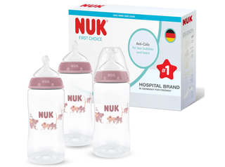Set di 3 biberon Nuk First Choice con sistema anticolica. - Capacità: 300 ml. - Colore: Rosa. Design con simpatici animaletti. - Tettarella in silicone. - Senza BPA. Vendo Nuk biberon anticolica 3 pezzi con controllo della temperatura 300ml . Nuovo con scatola. 3 pezzi nuk biberon , con controllo della temperatura, anticolica grazie alla valvola che previene l'ingestione d'aria. Tacca centrale che indica la temperatura corretta , se freddo , caldo , tiepido. Da 300 ml. Marca numero 1 in Germania favorisce la poppata naturale e tranquilla riducendo le bolle d'aria ed evitando così le fastidiose coliche . Facile da pulire , adatto a