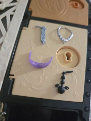 Set di accessori per bambole Monster High. - Collana argentata con strass. - Ciondolo nero a forma di pipistrello. - Accessorio viola a forma di arco. - Accessorio grigio con dettagli. - Chiave per serratura.