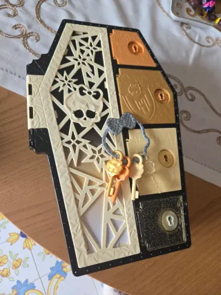 Armadietto a forma di bara di Monster High, colore beige e nero, con decorazioni a tema. - Include 4 chiavi colorate. - Presenta un design a scomparti con serrature. - Decorato con il logo di Monster High e ragnatele.
