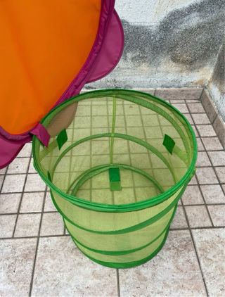 Cesta porta giocattoli in rete con coperchio a forma di fiore removibile. È lievemente usurato sul fondo, per il resto in ottime condizioni.
