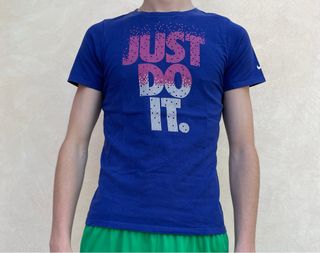 T-shirt blu a maniche corte per bambino con stampa Just Do It di Nike. Presenta il logo Nike sulla manica. - Colore: Blu - Stampa: Just Do It - Logo Nike sulla manica