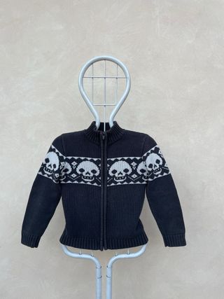 Maglioncino H&M bambino, ottime condizioni del tessuto, presenta solo un’alone più chiaro sul gomito. Colore grigio scuro con teschi.
