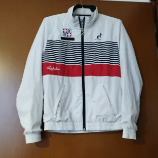 Giacc felpa tuta da ginnastica vintage Australian by L'alpina, chiusura con zip e tasche con zip. Unisex. Colore base bianco, con dettagli rossi , beri e blu. Taglia bambino L, taglia donna S. Ottime condizioni. #acetato #tennis