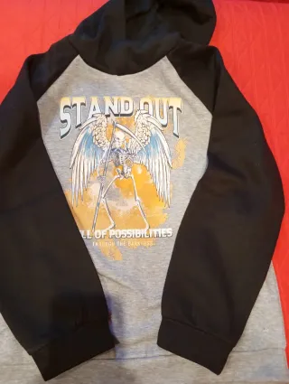 Felpa con cappuccio per ragazzo, taglia 13/14 anni. Presenta una stampa grafica sul davanti. - Maniche lunghe raglan nere. - Corpo grigio melange. - Cappuccio con fodera nera. - Presenta un piccolo buchino visibile in foto.