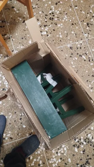 Set di tavolino per bambini con scacchiera e due sgabelli. Scacchiera con caselle nere e beige. Design scacchiera sul tavolo e orsetti sugli sgabelli. Struttura del tavolo e degli sgabelli in verde. Il tavolo ha il suo tempo ed è artigianale, quindi presenta lievi difetti nella vernice, per la sua età e l'uso. La scacchiera ha una certa curvatura, dovuta al passare degli anni e al peso sopra, ma nulla che impedisca l'uso. Si spedisce smontato. Montaggio facile inserendo le gambe, con 4 viti incluse.