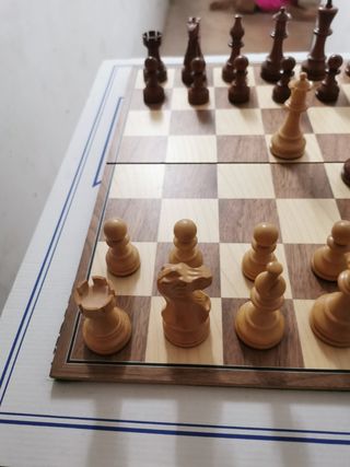Scacchiera classica con un design in legno. - Design a scacchiera di legno scuro e chiaro. - Bordi con numerazione e lettere. - Pezzi inclusi