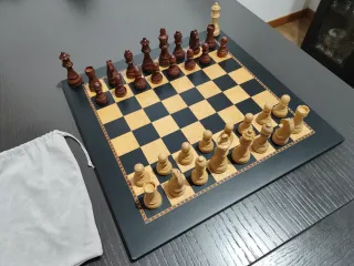 Scacchiera da 45 cm modello Gambito di Dama con set di pezzi in legno e borsa di tela per riporli. Entrambi gli articoli sono completamente nuovi, mai usati. Spedizione o consegna a mano a Betanzos o Santa Cruz (Oleiros).