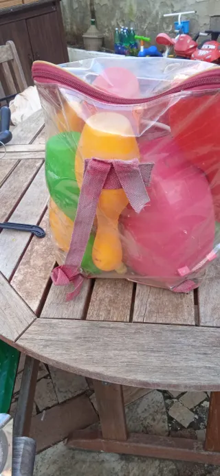 Borsa trasparente piena di giochi colorati per bambini. - Giochi di plastica. - Colori vivaci. - Ideale per giocare all'aperto.