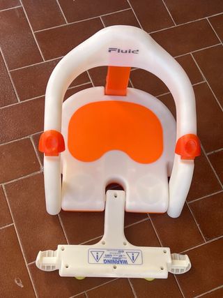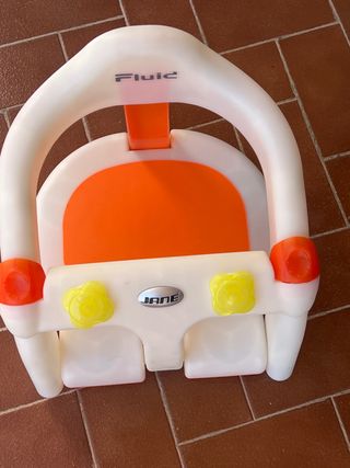 Sedia da bagno per neonati del marchio Jané, con un design in bianco e arancione. Si apre per sedere il bambino e ha ventose per evitare che scivoli. Prezzi negoziabili.