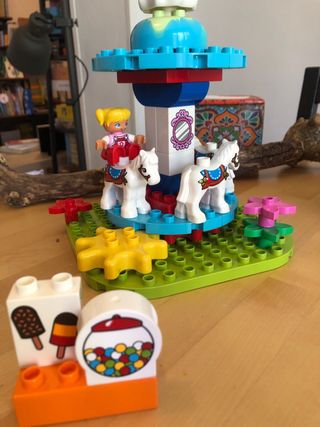 Set di costruzione Lego Duplo a tema parco divertimenti. Include varie attrazioni e figure. - Carousel mobile. - Ruota panoramica mobile. - Scivoli. - Macchina. - Figure di bambini e bambine.