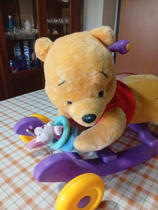 Cavalcabile Winnie the Pooh con simpatiche ruote gialle. - Struttura in plastica viola. - Personaggio Winnie the Pooh in peluche.