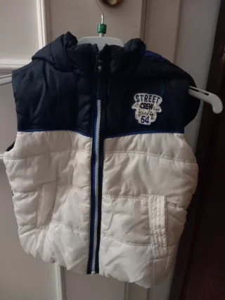 Caldo piumino smanicato per bambino con cappuccio - Colore blu e bianco - Chiusura con zip - Patch Street Crew 54 sul petto - Tasche laterali - Marca Fagottino