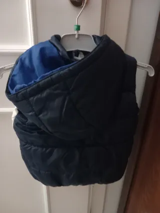 Giacchino per mezze stagioni Kiabi. - Taglia 0-3 mesi (56-62 cm) - Colore blu scuro con dettagli a righe grigie e marroni sui polsini e sul fondo. - Cappuccio foderato in grigio. - Patch marrone sul petto.