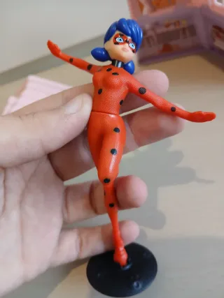 Set di 6 pezzi di giocattoli a tema Miraculous. Acquistabili anche singolarmente o in set personalizzati. Contattatemi per più info sui prezzi. - Personaggio con testa grande stile chibi a tema ape. - Due action figure di personaggi femminili. - Accessori assortiti tra cui una base rossa con dettagli neri e rosa, un accessorio rosa con simbolo di coccinella e un accessorio azzurro.
