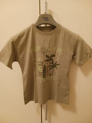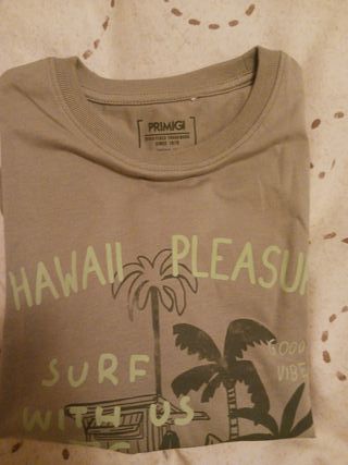 T-shirt cachi con stampa a tema Hawaii. - Stampa Hawaii Pleasure con palme e tavole da surf. - Scritta Surf with good vibes. - Colore cachi.