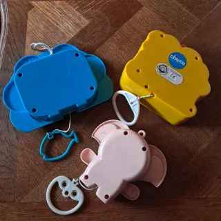 Lotto composto da tre carillon vintage per lettino. - Carillon con bambina, cane e barca. - Carillon con orsetto e coniglietto. - Carillon a forma di elefante rosa.