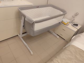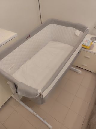 Culla Joyello Mammola grigia per neonato, completamente smontabile e chiudibile. Regolabile in altezza e in 6 posizioni. Completamente lavabile. Materassino alto 5cm, con 2 cinghie per ancoraggio al letto. Un lato apribile con cerniera. Da 0 a 6 mesi, fino a 9 kg. Usato, come nuovo, ben tenuta