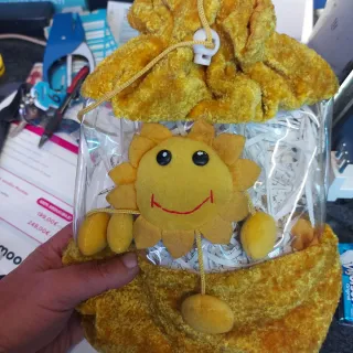 Zainetto per bambini a forma di sole, realizzato in morbido peluche giallo. - Design allegro e colorato. - Chiusura con cordoncino. - Dettagli ricamati sul viso.