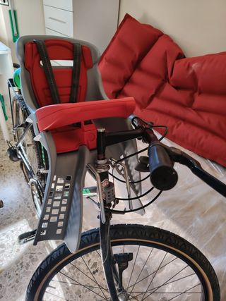 Seggiolino per bicicletta per bambini, dal design moderno e funzionale. - Colore rosso e grigio. - Cinture di sicurezza integrate. - Poggiapiedi regolabili.
