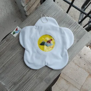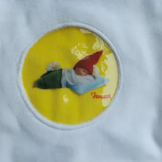 Porta cuscino a forma di fiore, originale Fiorucci, perfetto per i più piccoli. Presenta un simpatico disegno di un bimbo gnome che dorme su una nuvola gialla. - Design a forma di fiore. - Immagine di un bimbo gnome. - Marchio Fiorucci.