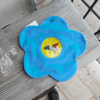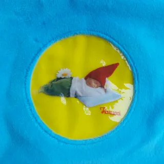 Porta cuscino a forma di fiore, originale Fiorucci, pensato per i più piccoli. - Design a forma di fiore. - Immagine di un simpatico gnomo addormentato. - Colore azzurro con sfumature.