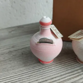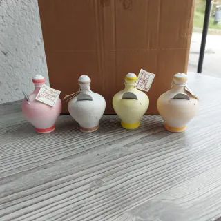 Set di 4 salvadanai della fortuna in ceramica. - Colori assortiti: rosa, bianco, giallo e arancione. - Design a forma di bottiglia con fessura per le monete. - Decorazioni artigianali. 1 euro cadauno