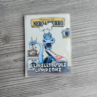 Portafoto a tema calcistico con Le Ricette dei Campioni. - Copertina con disegno di un personaggio a tema Inter. - Titolo Trattoria del Neroazzurro. - Scritta Le Ricette dei Campioni in basso.