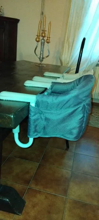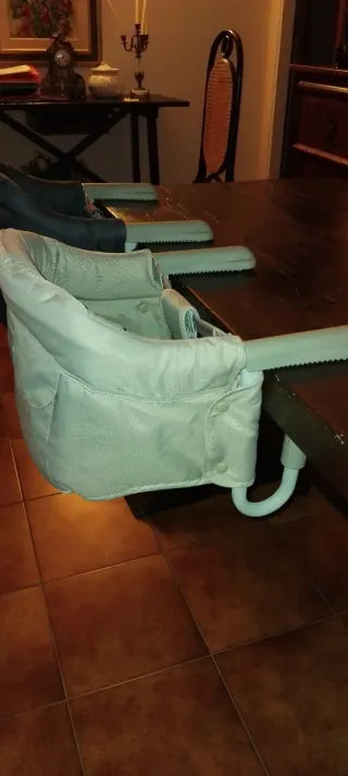 Seggiolino da tavolo per bambini, pratico e sicuro. - Tessuto lavabile. - Facile da agganciare al tavolo. - Tasche laterali portaoggetti.