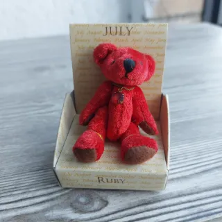 Dolce orsetto di peluche rosso, perfetto come idea regalo o da collezione. Presentato in una scatolina decorata con i mesi dell'anno e la scritta RUBY. - Colore: Rosso - Dettaglio: Ciondolo a forma di cuore con pietra rossa - Decorazione scatola: Mesi dell'anno e RUBY