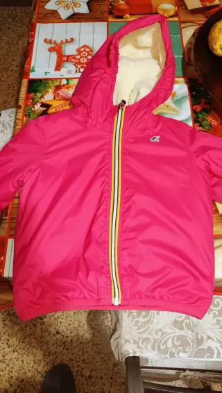 K-way per bambina, taglia 18 mesi. Giacca con cappuccio foderato in pile. - Colore fucsia. - Zip frontale con dettagli colorati. - Logo K-way sul petto.