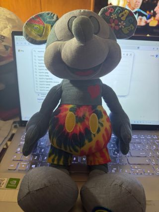 Peluche di Topolino, edizione limitata. - Design unico con dettagli colorati. - Orecchie decorate con motivi floreali e patchwork. - Pantaloncini con stampa tie-dye. - Cuore rosso applicato sul petto.