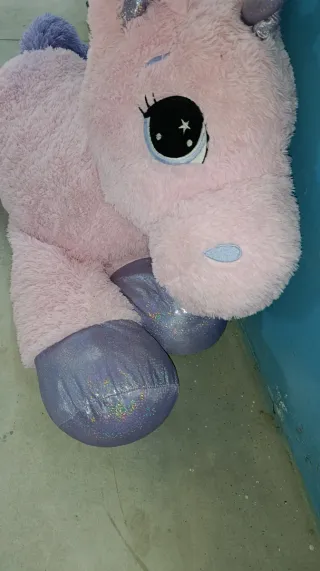 Morbido peluche a forma di unicorno, perfetto per decorare una cameretta o per giocare. Dimensioni 100 cm - Colore principale rosa con dettagli viola. - Materiale soffice e piacevole al tatto. - Zampe con inserti glitterati viola.