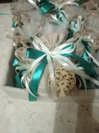 Set di sacchetti regalo in juta, perfetti per compleanni o altre occasioni speciali. Ogni sacchetto è rifinito con nastri in raso color verde acqua e bianco, e un piccolo decoro in legno, senza confetti - Materiale: Juta e raso - Colore nastri: Verde acqua e bianco - Decorazione: Legno intagliato € 1.30 al pz