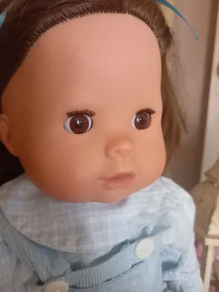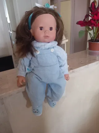 Bambola con un grazioso completo azzurro. Cm 42 . "GOTZ" - Tuta in velluto a coste. - Camicia a quadri. - Scarpe con disegno di coniglietto.