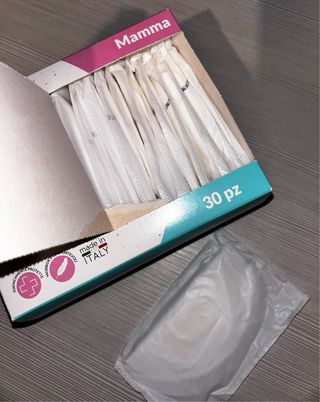 Confezione di coppette assorbilatte Neo Baby per la mamma. Aperta la scatola.Le coppette sono confezionate in sacchetti monouso. C’e ne sono 26 invece di 30 pezzi. - Ultra sottili - Super assorbenti - Super traspiranti - Morbide e confortevoli - Realizzate in Italia