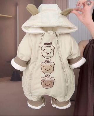Morbida tuta invernale per neonati, perfetta per tenere al caldo i più piccoli. - Design con cappuccio e orecchie. - Applicazioni a forma di orsetto sul davanti. - Zip frontale per facilitare l'indossamento. - Polsini e caviglie a contrasto.