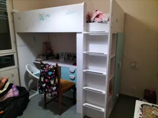 Vendo cameretta Ikea per bambini in ottime condizioni. La struttura è completa di letto a soppalco, scrivania con cassetti e scaletta. - Letto a soppalco con decorazioni a tema unicorno. - Scrivania con piano azzurro e due cassetti. - Scaletta bianca per accedere al letto. - Struttura in legno bianco.