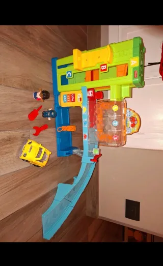 Autolavaggio giocattolo Fisher-Price con accessori. - Include macchinine e personaggi. - Parti colorate in plastica.